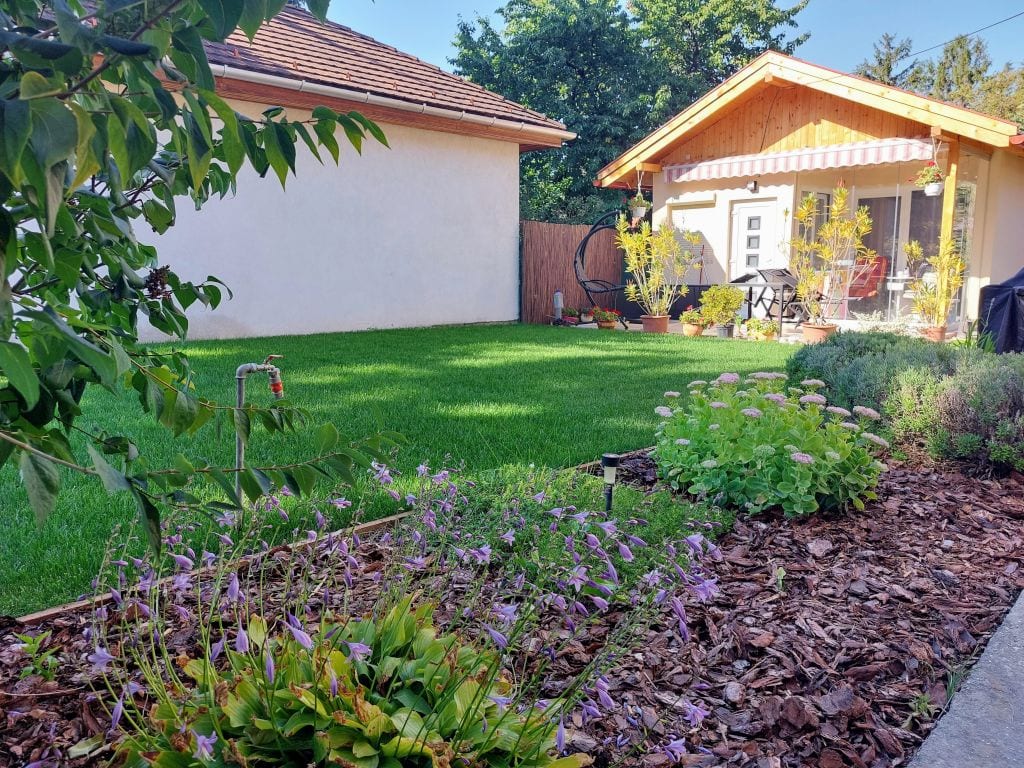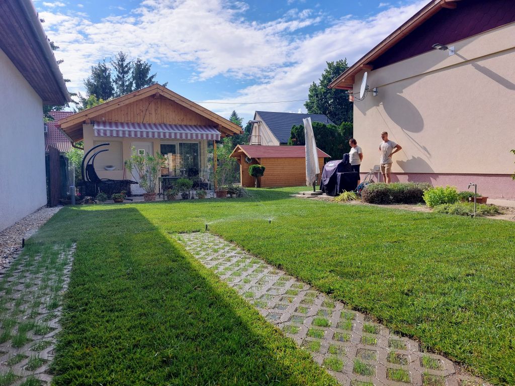 Általában már egy kisebb családi házas vagy nyaralós építkezés sem kíméli közvetlen környezetét, azaz a kertet. Hát még esetünkben, amikor egy minitelekre építenek egy második, kis házat! Ez volt az előzmény, amiért Balatonkenesére hívtak bennünket. Az építkezés utáni káoszból kellett egy kellemes pihenőkertet varázsolnunk budapesti ügyfeleinknek. A terepmunkák elvégzése, a gyepszőnyeg telepítés és a növényágyak felfrissítésének szükségessége nem volt kérdés. Kizárólag a HUNTER automata öntözőrendszer telepítése volt az, aminek az ára nem akart beleférni a költségvetésbe. De Istennek hála csúszott annyit az építkezés – 1 teljes évet! –, hogy ügyfelünknek időközben mégiscsak sikerült forrást találnia erre a nagyon fontos tételre is.