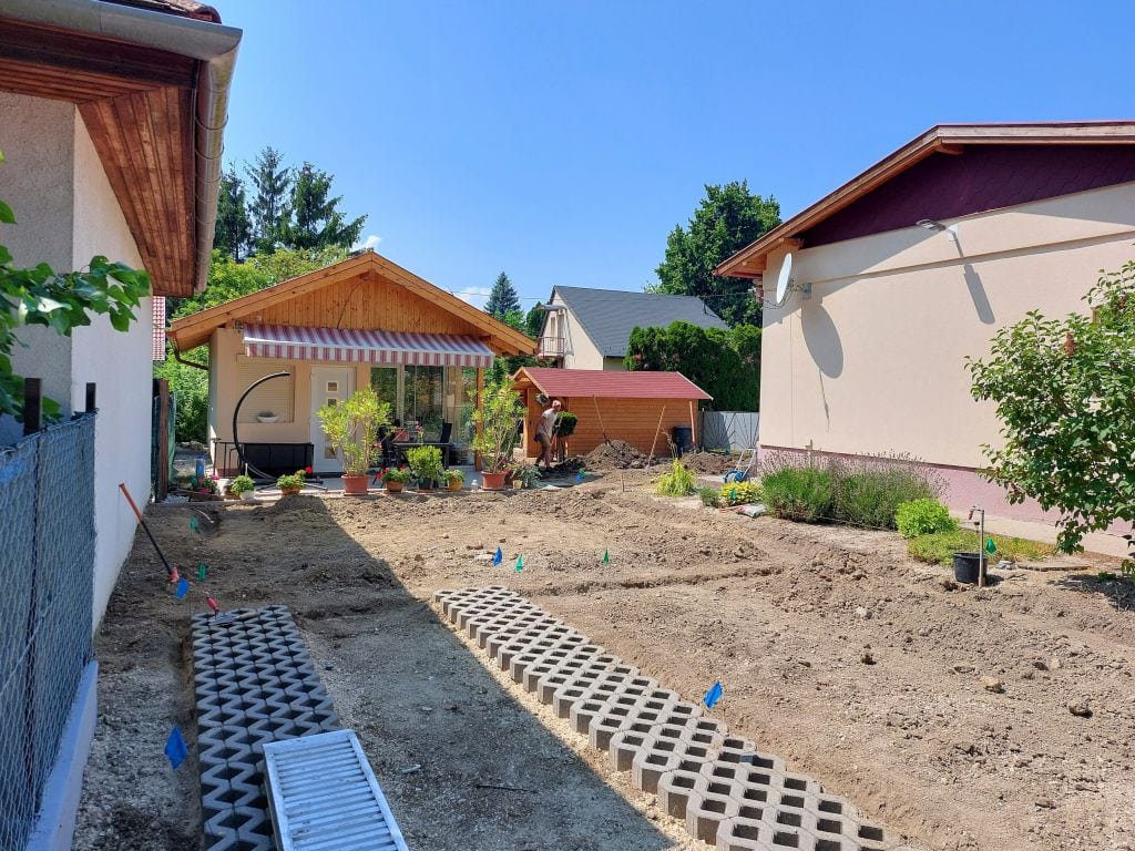 A terület előkészítése a szokott módon történt. A felső 2-3 cm-es talajréteg eltávolítása után következett a rotálás, azaz 15 cm mélységben a föld fellazítása és kitakarítása. Itt már sajnos ért minket némi kellemetlen meglepetés: véstünk betont, ástunk elő sittet, és szedtünk ki fenyőgyökeret 5 cm-re a villanykábel mellől. Mondhatnánk, hogy ez nem túl gyakori eset, de akkor bizony hazudnánk. Szóval semmi esetre sem bántásképpen, de a magyar építőipar ilyen: „Ami nekem nincsen útba, az ott marad; ami meg útban van, azt elásom!”